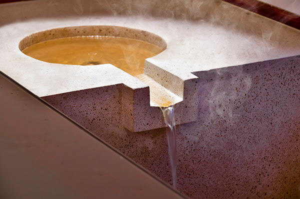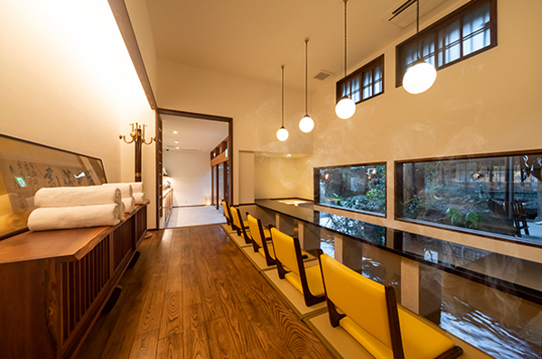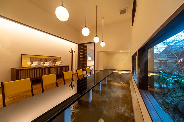 足湯カフェ18號室 史跡旅館の日本庭園を見渡せる足湯カフェ。カウン ターに厚さ30ミリ長さ約5メートルの 漆黒ガラスを配するとともに、 壁には漆喰を施して、モノトー ン調の 心和む空間となっています。 フロントに近接してあり、 チェックイン後などの疲れを ゆったり寛いで癒していただけます。 |