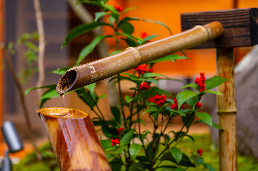 手水舎 大正館玄関そばにある、石と竹による簡素な手水舎です。 まずは清廉な水を注ぎ、 旅で疲れた手を潤してください。 |