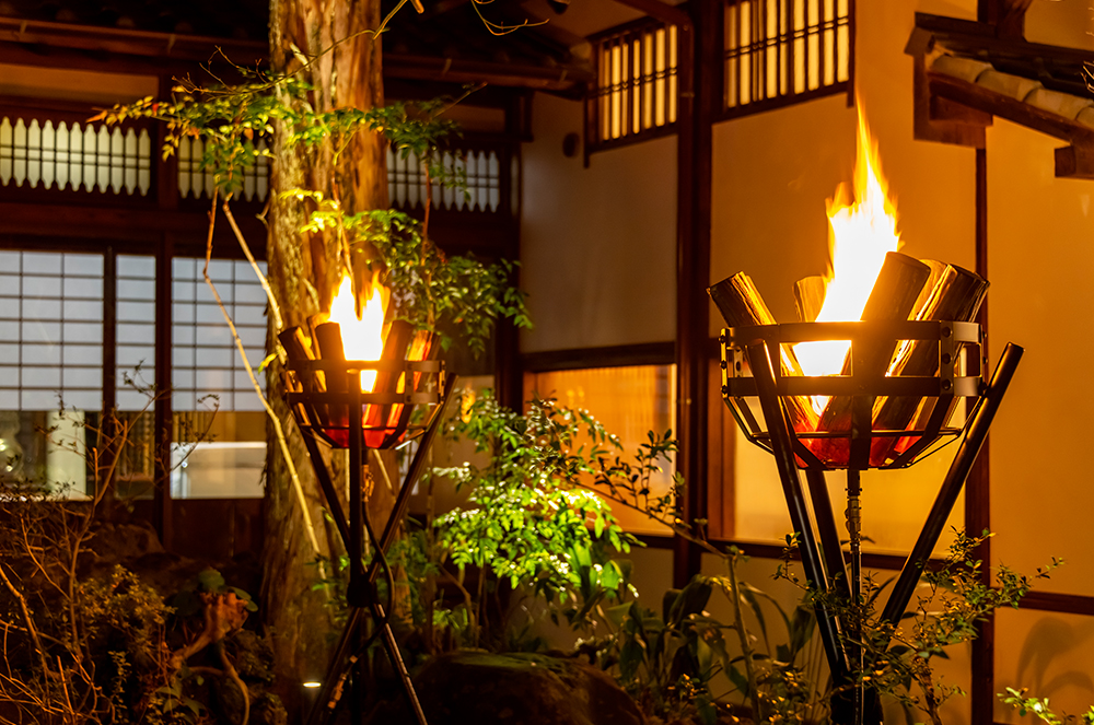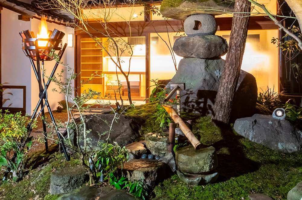 チェックイン 足湯に浸かりながらチェックインができるのも花月のおもてなしの一つです。 柿右衛門の湯呑でお茶を飲み、心を和ませでください。 また足湯の隣にある日本庭園に面したギャラリーでは、 骨董価値の高い逸品に加え、 有田焼をはじめとする厳選した陶磁器を展示販売しています。 眺めるだけでも心豊かになる 「花月」ならではのおもてなしです。 |